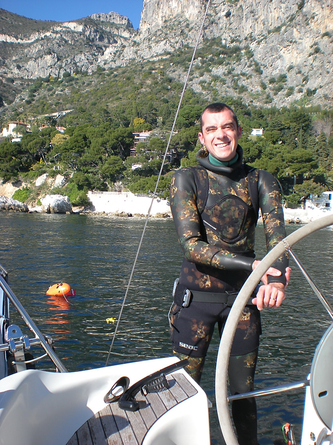 In effetti la prima pescata in acque francesi è arrivata molto più tardi del previsto: il trasferimento della nostra nuova barca (più che nuova, in realtà un gloriosissimo usato) al porto di Beaulieu, per sfuggire alle rapine legalizzate del Marina degli Aregai e in generale della nautica italiota, è avvenuto il 28 dicembre 2010. Siamo poi rimasti due settimane in quel porto, assaporandone l'atmosfera, la fantastica limpida e lineare organizzazione, il maniaco ordine, la pulizia, l'efficienza. In due settimane ben speravo di potermi confrontare coi fondali locali, sperando di far conoscenza coi "luassi" d'oltre frontiera. Invece, false e fuorivianti informazioni su un supposto divieto totale di pesca in apnea, assieme ad un meteo che dir pessimo è poco (due settimane di cielo grigio, coperto, con frequenti piogge e a volte mare più che imbronciato) hanno stroncato ogni mio proposito.